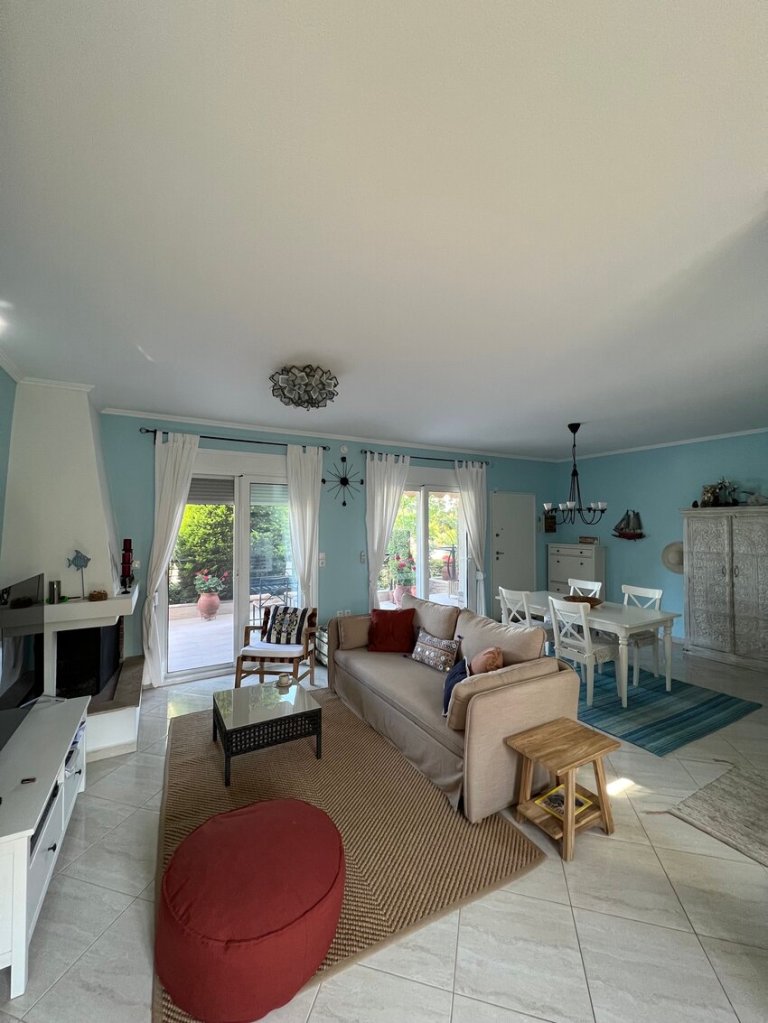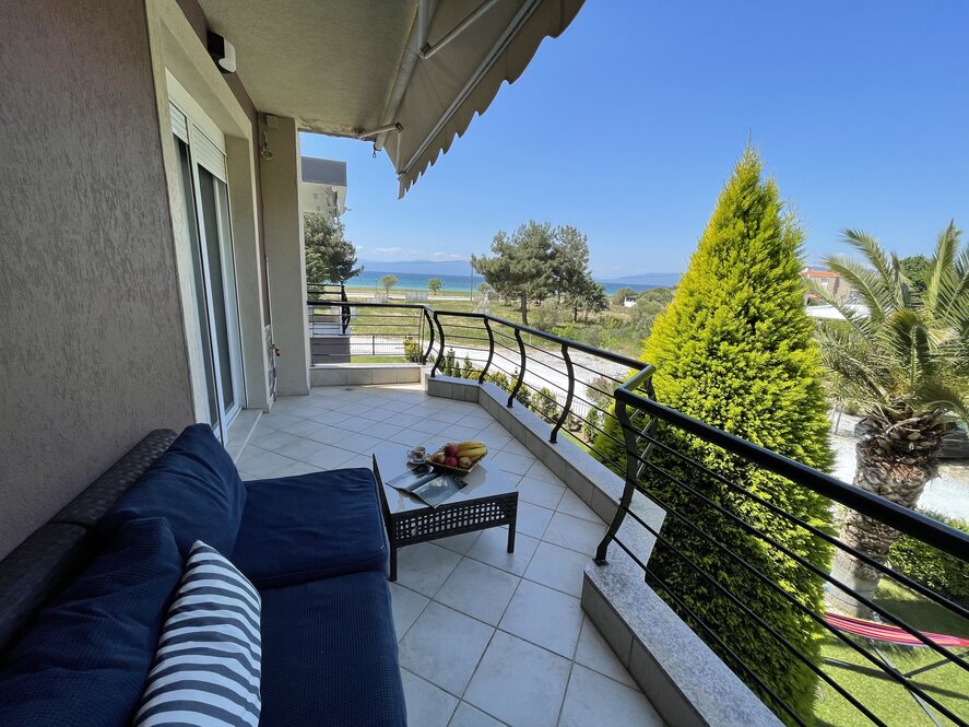 Стилна и удобна средиземноморска вила, в която можете истински да се отпуснете и насладите на гръцкото море, слънце и храна. Приземният етаж е обширно отворено пространство с маса за хранене, мека мебел с кът за гледане на телевизия. Зад него е разположена кухня с всички удобства за готвене. Приземният етаж разполага с баня с душ кабина. Диванът е разтегателен и осигурява две допълнителни места за спане.